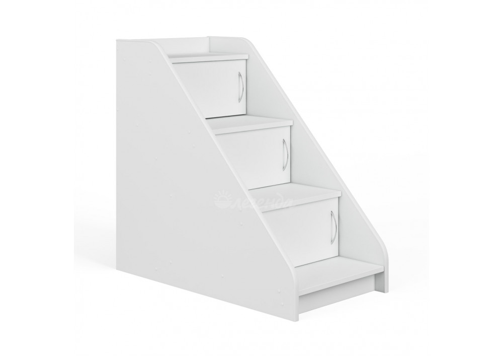 Невысокая угловая лестница из четырех ступенек белого цвета .Лестница одновременно выполняет функцию стеллажа.