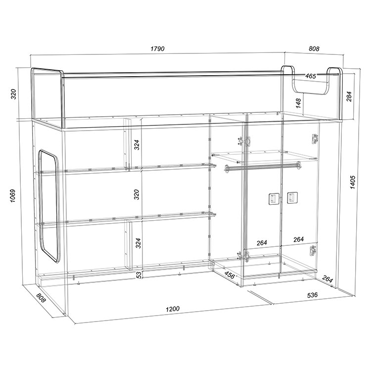 Внизу располагается игровая зона с полками – свой уголок для ребенка.
